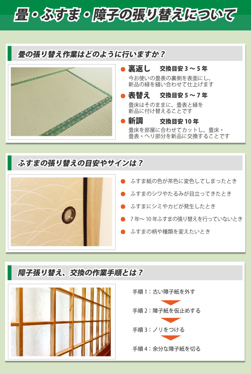 快適な生活のためにも、畳・襖・障子を張り替える目安についても知っておきましょう。畳は経年劣化により、変色、傷、きしみなどが目立ってくるかと思います。畳であれば、3年~5年で裏返し、5年~7年で表替え、10年ほどで新調を検討しましょう。襖は、日焼け、シミ、たるみなどがわかりやすいですが、そういったものが見当たらなくても、前回の張り替えから7年から10年が経っている場合は張り替えをおすすめいたします。障子は、紫外線、湿気の影響により劣化が進むため、最低でも5年おきには張り替えを行いましょう。畳・襖・障子が破れている、汚れていると見栄えが悪いだけでなく、カビの発生など健康にもよくありません。張り替えについてお悩み、検討中の方は、まずはお気軽にご相談ください。
